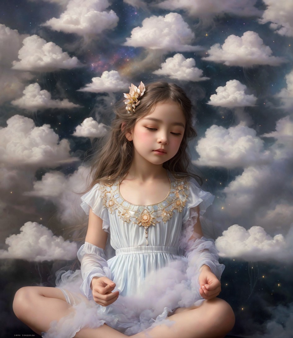 + Prompt:Wispy ghost child sitting in lotus position transforms into clouds and smoke. In the style of Pino Daeni, Josephine Wall and Karol Bak. Celestial, cosmic, soft billowing smoke, smoke clouds, clouds, heavenly, elegant, swirls, swirling, billowing, cinematic, unrealistic, high contrast, symbolism, magical, mystical, mystifying, obscure, perplexing.