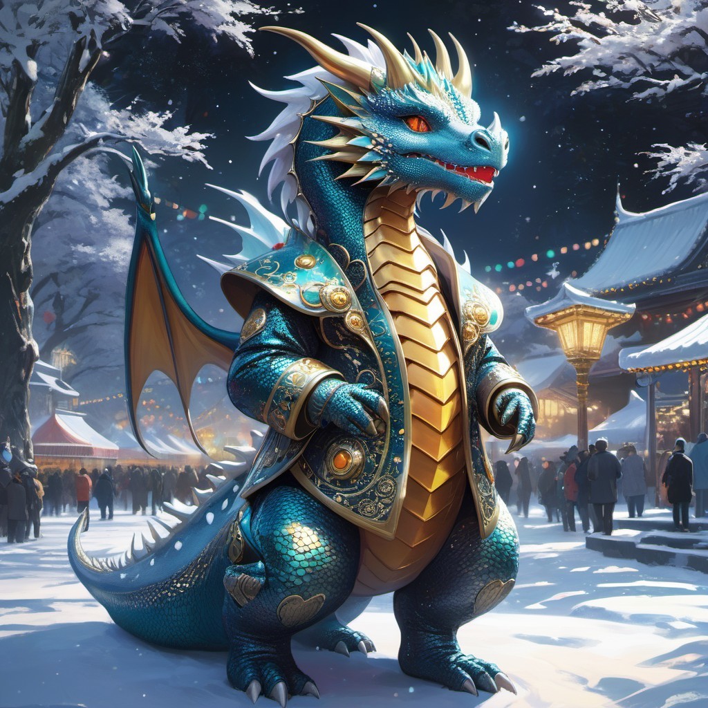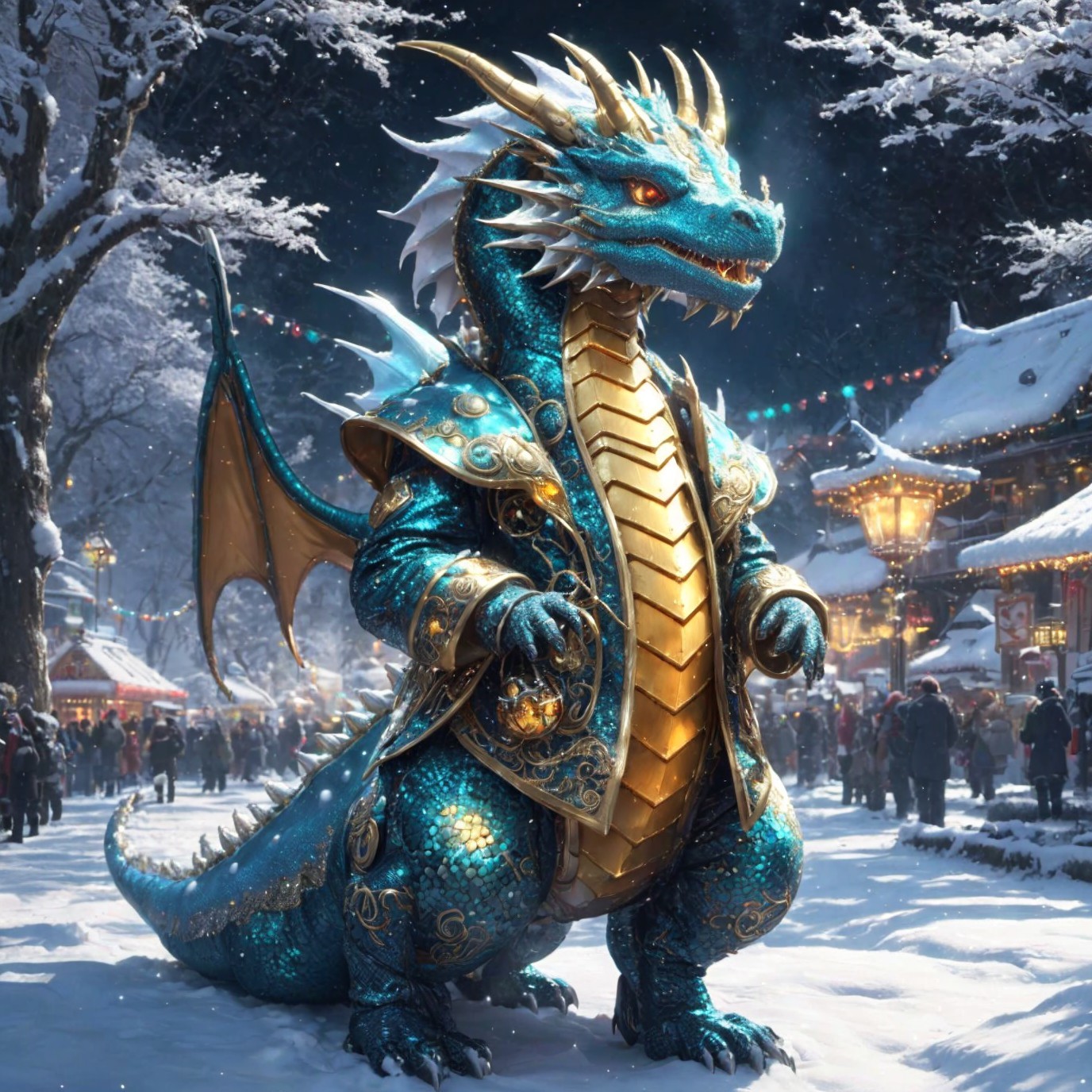 Golden and Turquoise Dragon in Snowy Festive Marketplace