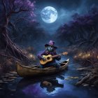 A whimsical scarecrow with a straw hat plays a tenor guitar in a serene, moonlit scene. It sits in a canoe on a tranquil, purple-tinted river surrounded by lush foliage and glowing orbs.