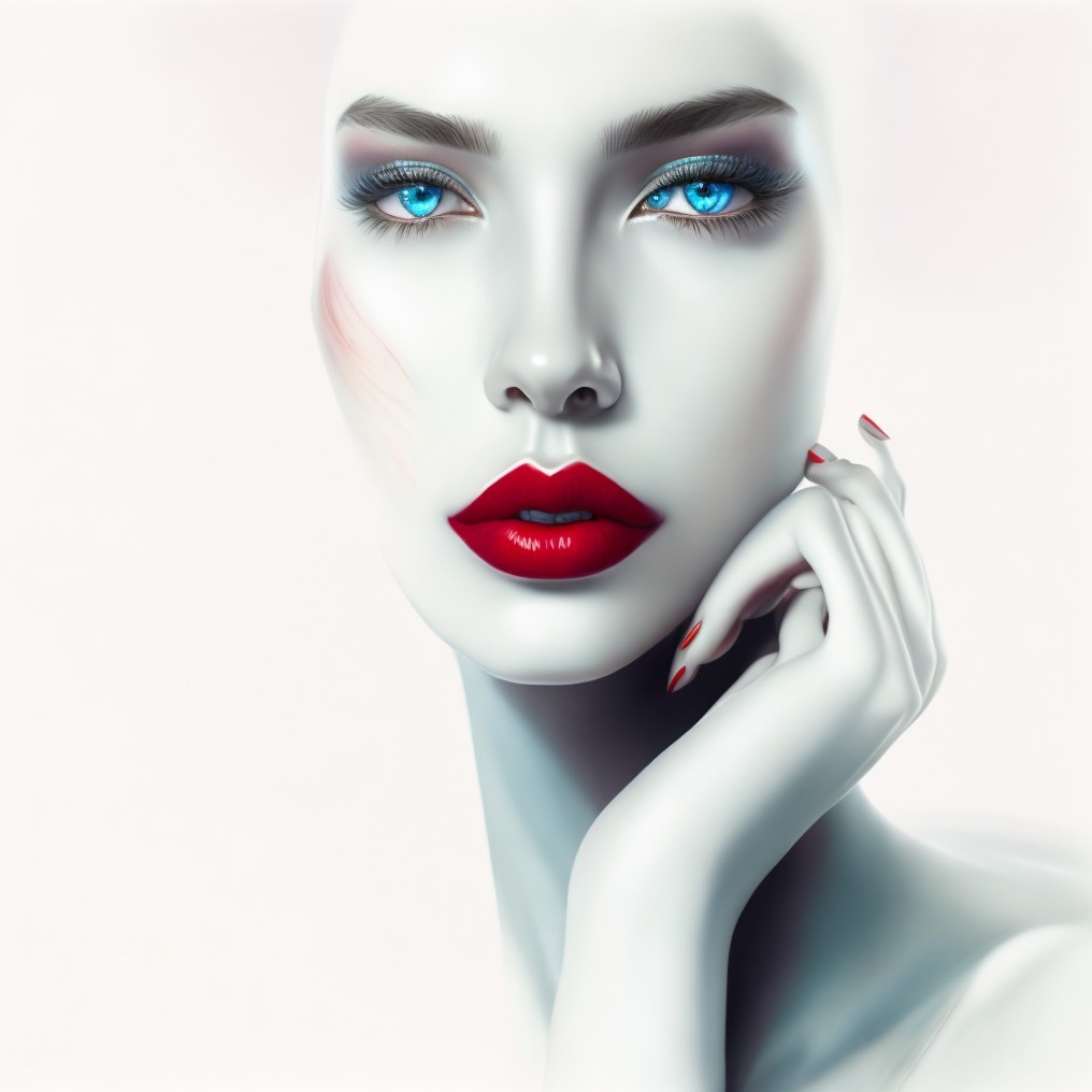 A digital artwork of a woman with a flawless porcelain-like complexion, striking red lips, and nails in a pensive pose.