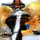 An abstract scene featuring a mix of orange, black, and white. A bold figure stands amid a blend of landscapes, with textures suggesting both nature and a hint of surrealism.