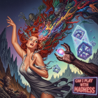 A surreal scene showcases a woman with flowing red hair, surrounded by vibrant, ethereal colors emerging from her mind, while a mysterious hand reaches for a glowing orb against a fantastical backdrop.