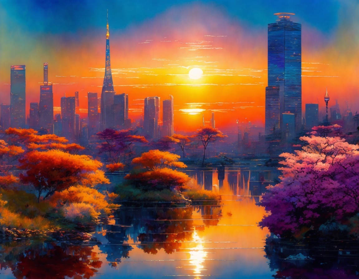 A vibrant sunset casts golden hues over a city skyline, featuring Tokyo Tower. Colorful trees reflect in a tranquil river, creating a serene yet lively atmosphere.