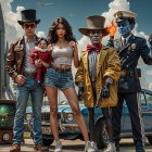 A vibrant scene features a vintage blue car with four characters: a man in sunglasses, a woman holding a toy rocket, a green-skinned alien cop, and a mysterious figure in a yellow coat. Clouds and birds fill the sky.