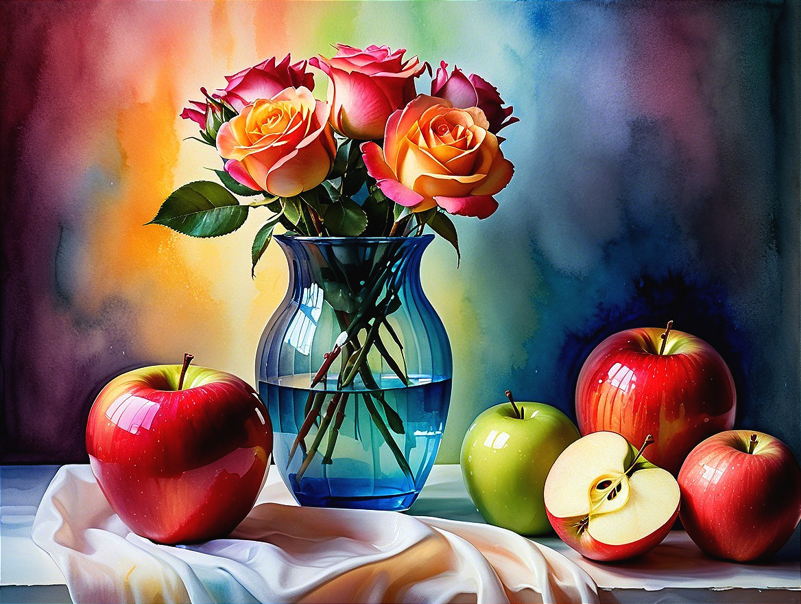 A vibrant still life featuring a vase of blooming roses in shades of pink and orange, surrounded by glossy red apples and a lit candle, against a colorful, softly blurred background.