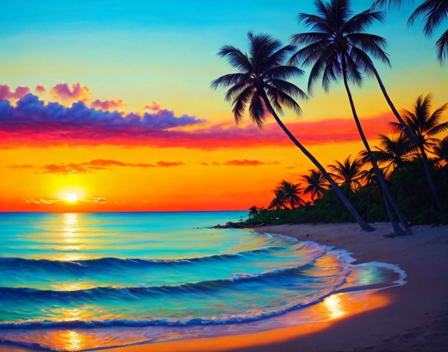 Create a place on the beach with turquoise water, powdery sand, lots of palm trees. The sun is setting over the water, making the sky colorful. There is a blonde tall man and a brunette woman on the beach. They are happy watching the sunset.