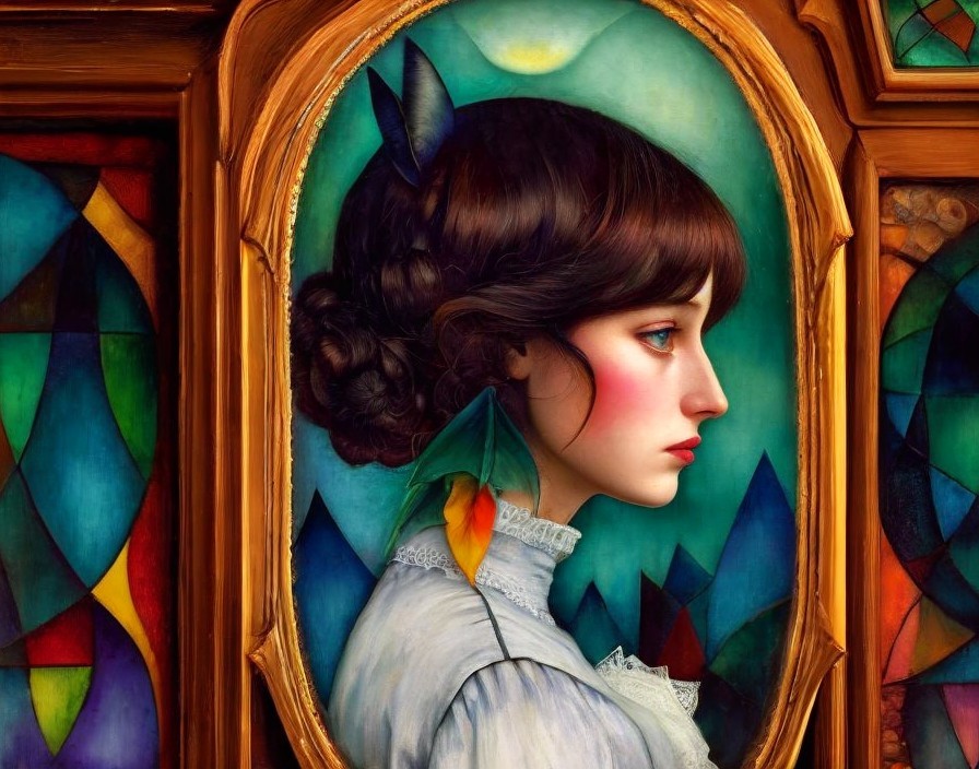 Surreal portrait of a woman with a braided updo and a cat, against a whimsical backdrop with moons and architectural elements.