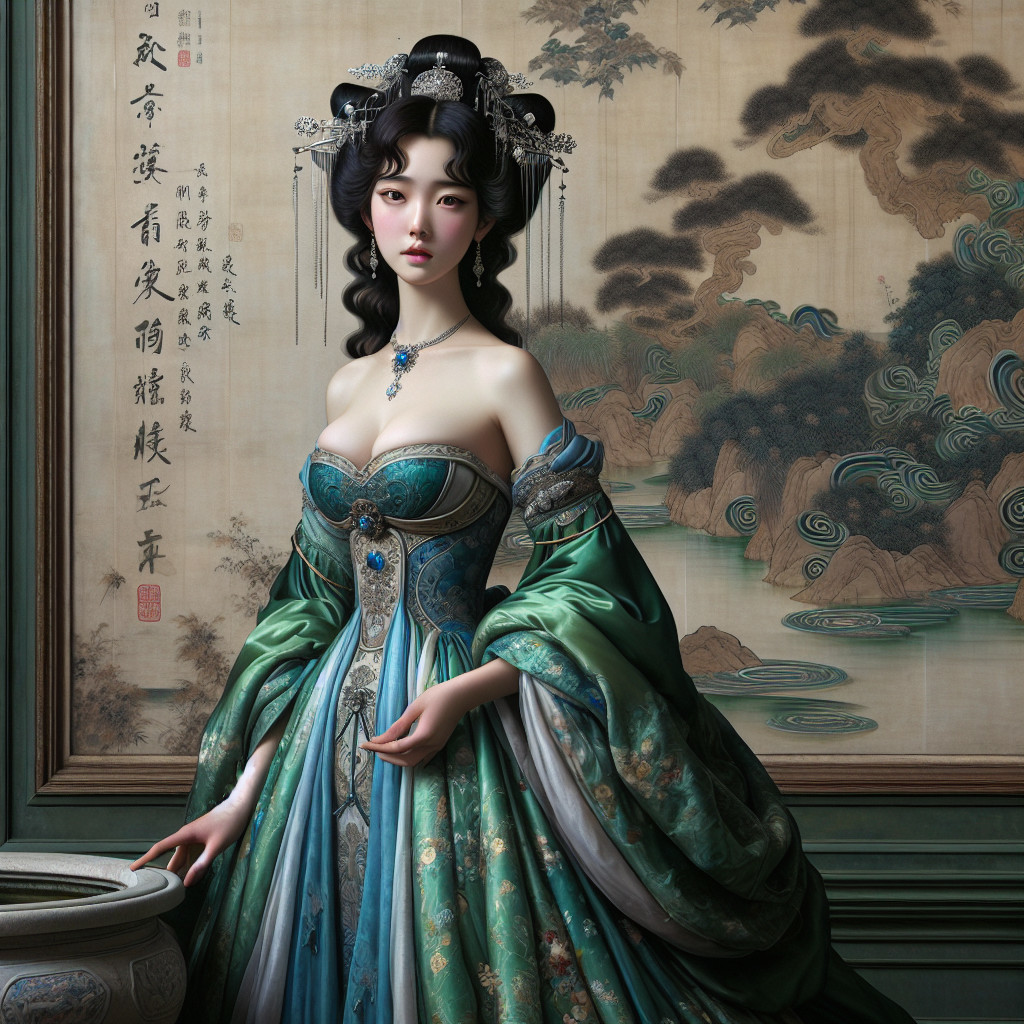 A woman elegantly dressed in silk awaits the emperor. Her long, dark hair is adorned with silver pins and flowers. She will sing and recite poetry, and ease the mind and mood of the emperor.