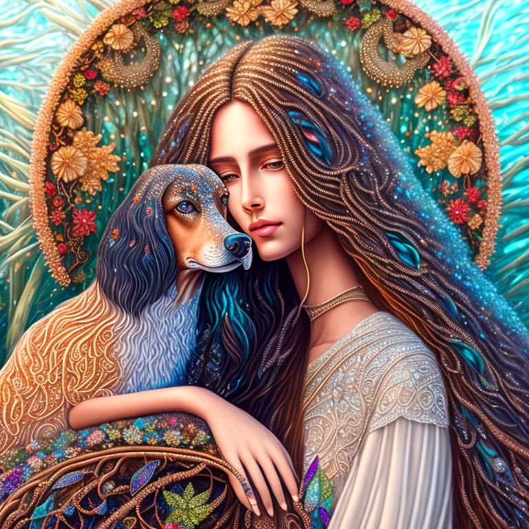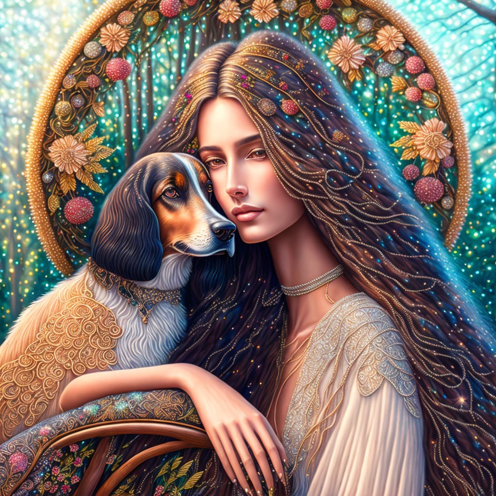 An illustration of a woman with long dark hair embracing a beagle, against a mystical forest background with ornate details.
