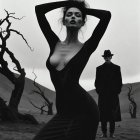 A mysterious female fairy with dark, translucent wings, perched on a tree branch, wearing a revealing black dress, in a black and white photograph in a nature setting in the style of fashion photography, a mysterious female wearing a black dress with deep v-neck, she has butterfly wings and a wreath on