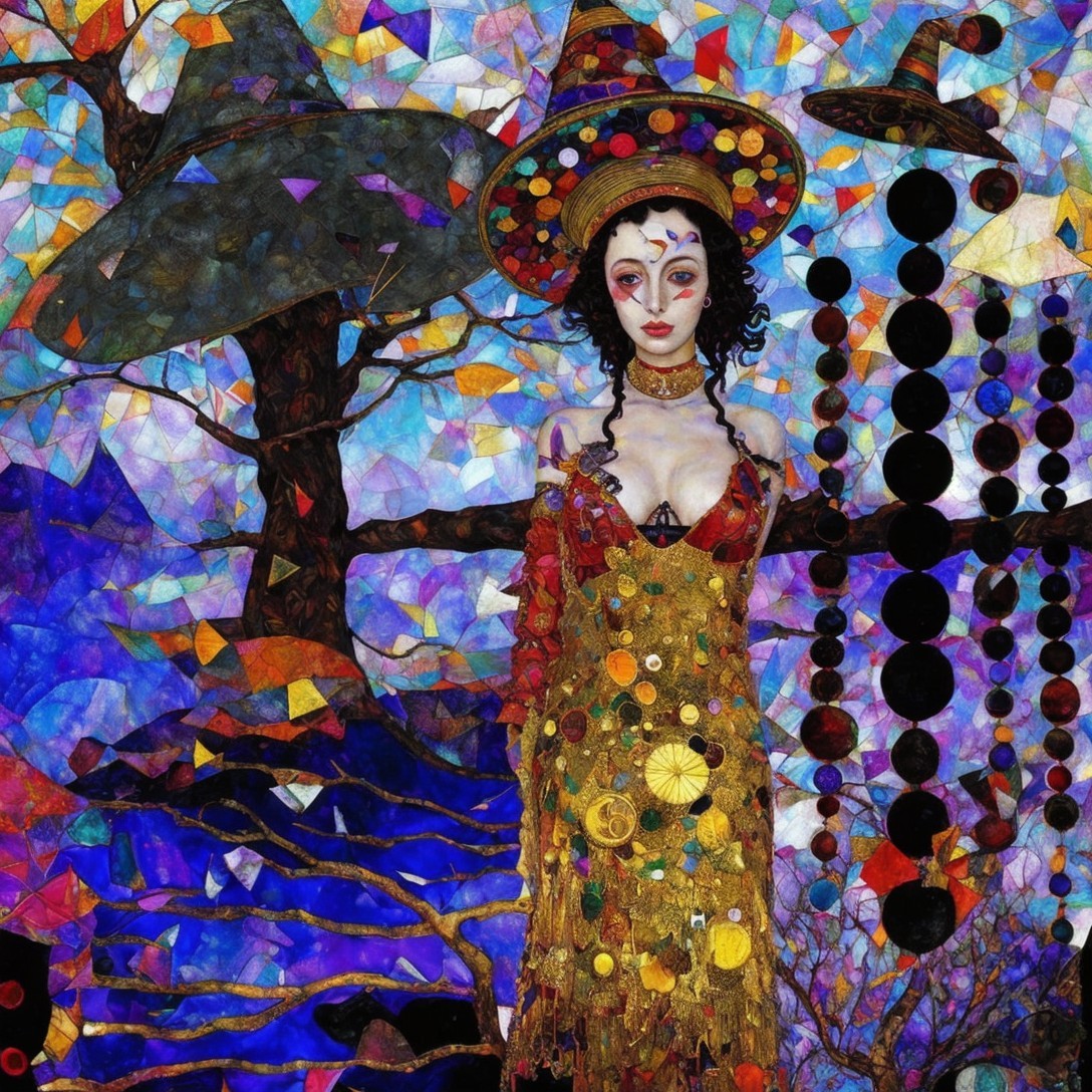 A colorful portrayal of a woman in an ornate witch costume against a mosaic backdrop with a whimsical vibe.