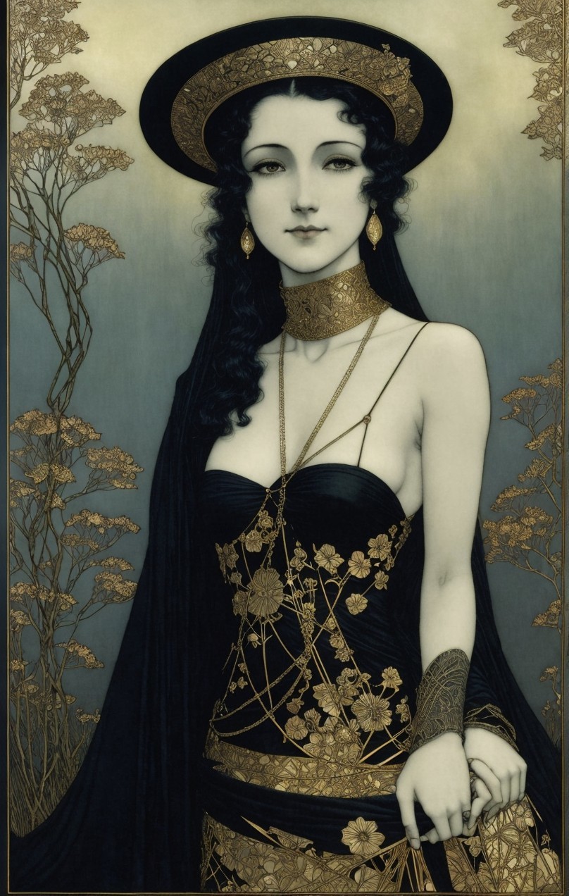 The image features a woman in an elegant black gown with intricate gold patterns, adorned with jewelry. She has a serene expression, framed by dark hair and a soft light halo behind her.