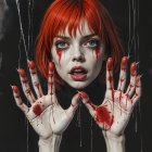 The image features a woman with striking red hair and bold makeup, dressed in black and red lingerie. Her hands are covered in a red substance, creating a dramatic and edgy aesthetic.
