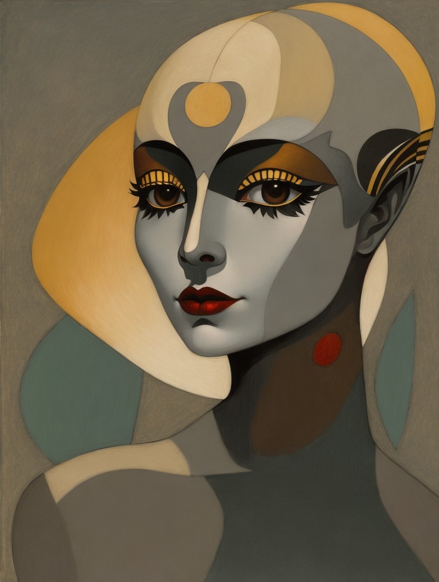 Artistic illustration of a stylized woman with a broad hat, bold makeup, and a checkered collar.