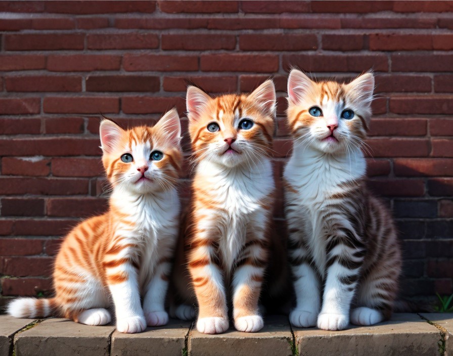 Five adorable kittens with striped fur sitting in a row against a brick wall background, looking upwards with curious eyes.