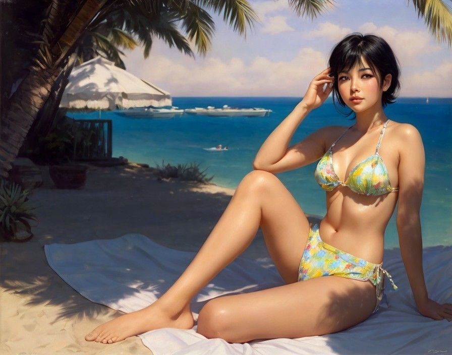 A pretty girl poses in a bikini against a backdrop of beach and ocean.