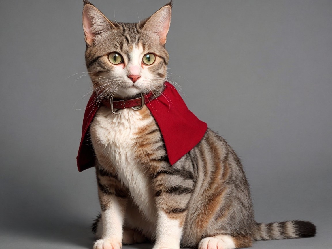 A stylish cat poses against a gray background, wearing a red cape and a brown collar. Its striking green eyes and distinct striped fur add to its playful charm.