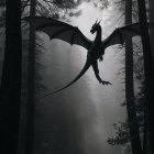A majestic, black dragon soars through a foggy forest, its wings outstretched against the dim light filtering through tall trees, creating an atmosphere of mystery and magic.