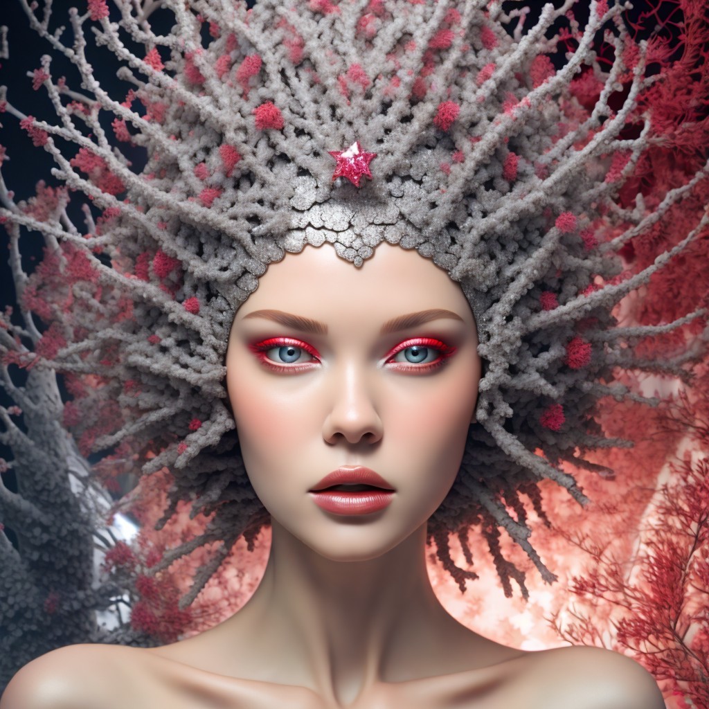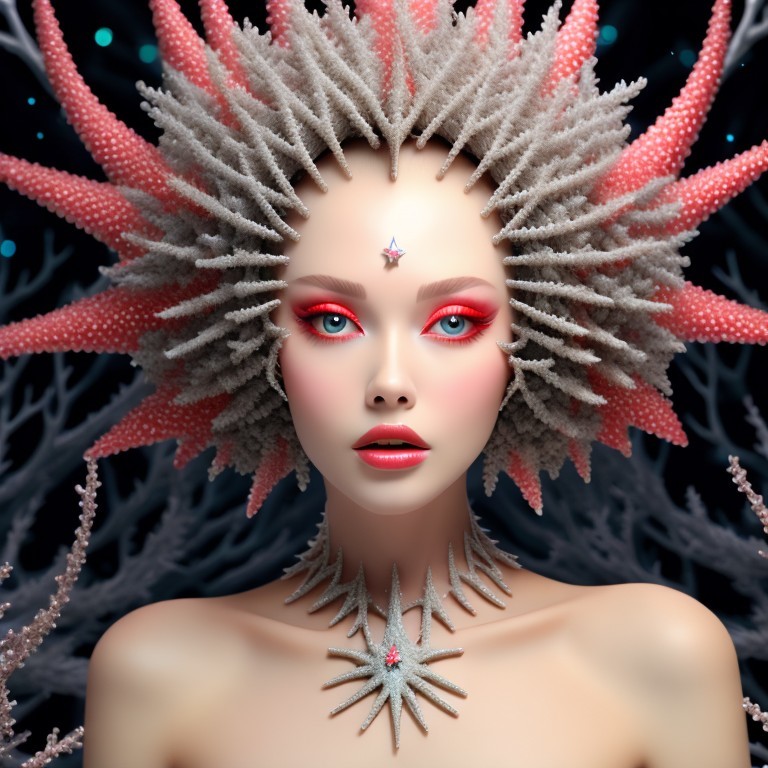 A fantastical figure with star-shaped, spiky white hair, striking red makeup, and a celestial background, exuding a mystical aura.