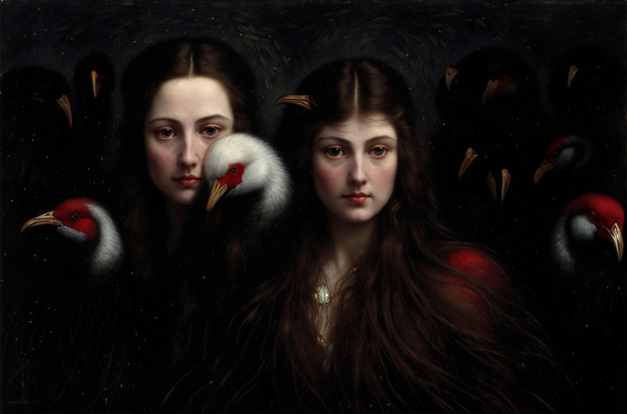 Two women with long brown hair surrounded by dark feathered birds with red beaks and white details on their heads.