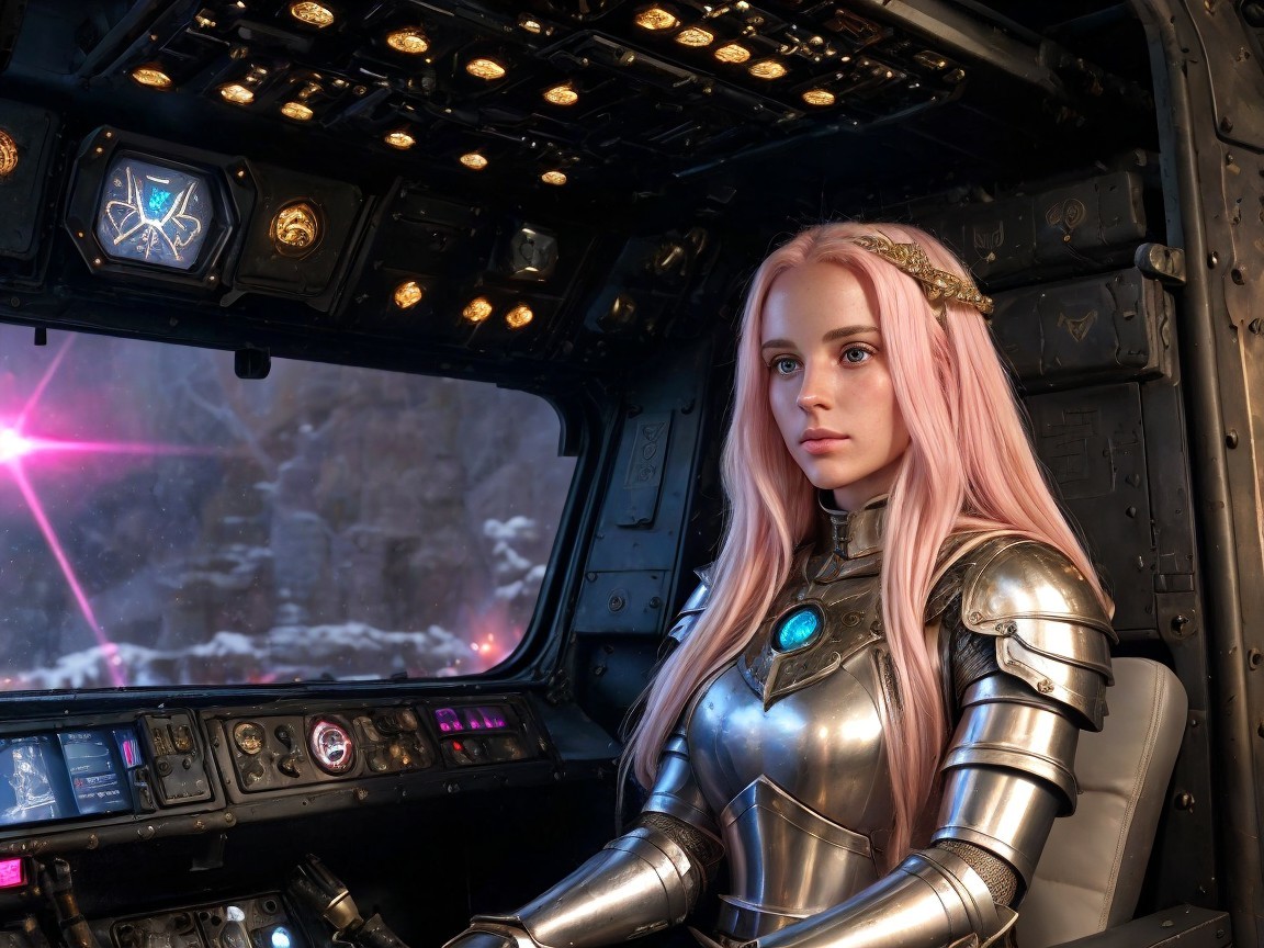 A young woman with long pink hair sits in a futuristic cockpit. She wears intricate silver armor, surrounded by ornate controls and a view of a medieval castle in the background.