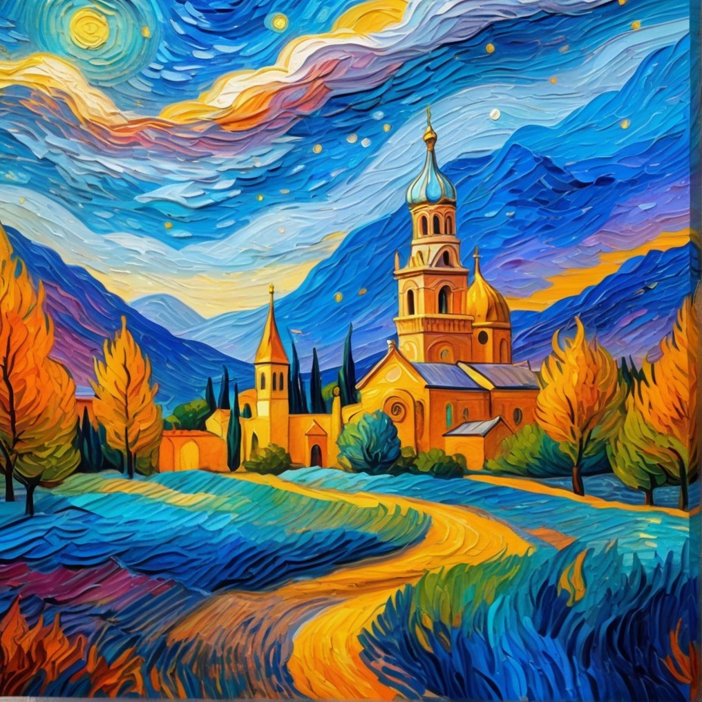 A vibrant, swirling landscape features a charming village with yellow buildings, spires, and lush trees, set against dramatic blue mountains and a starry sky, creating a dreamlike atmosphere.