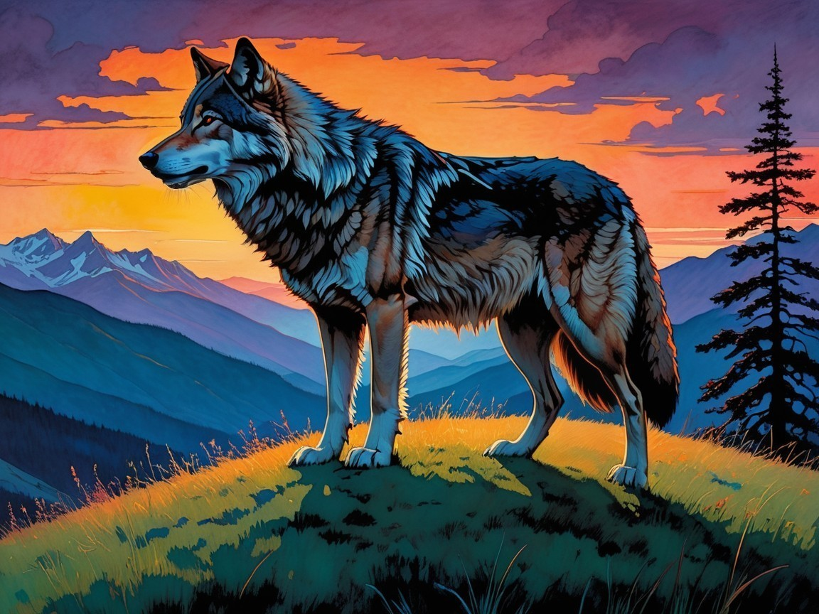 A majestic wolf stands atop a grassy hill, silhouetted against a vibrant sunset. The mountains loom in the background, the sky ablaze with warm colors. Tall trees frame the scene, enhancing its beauty.