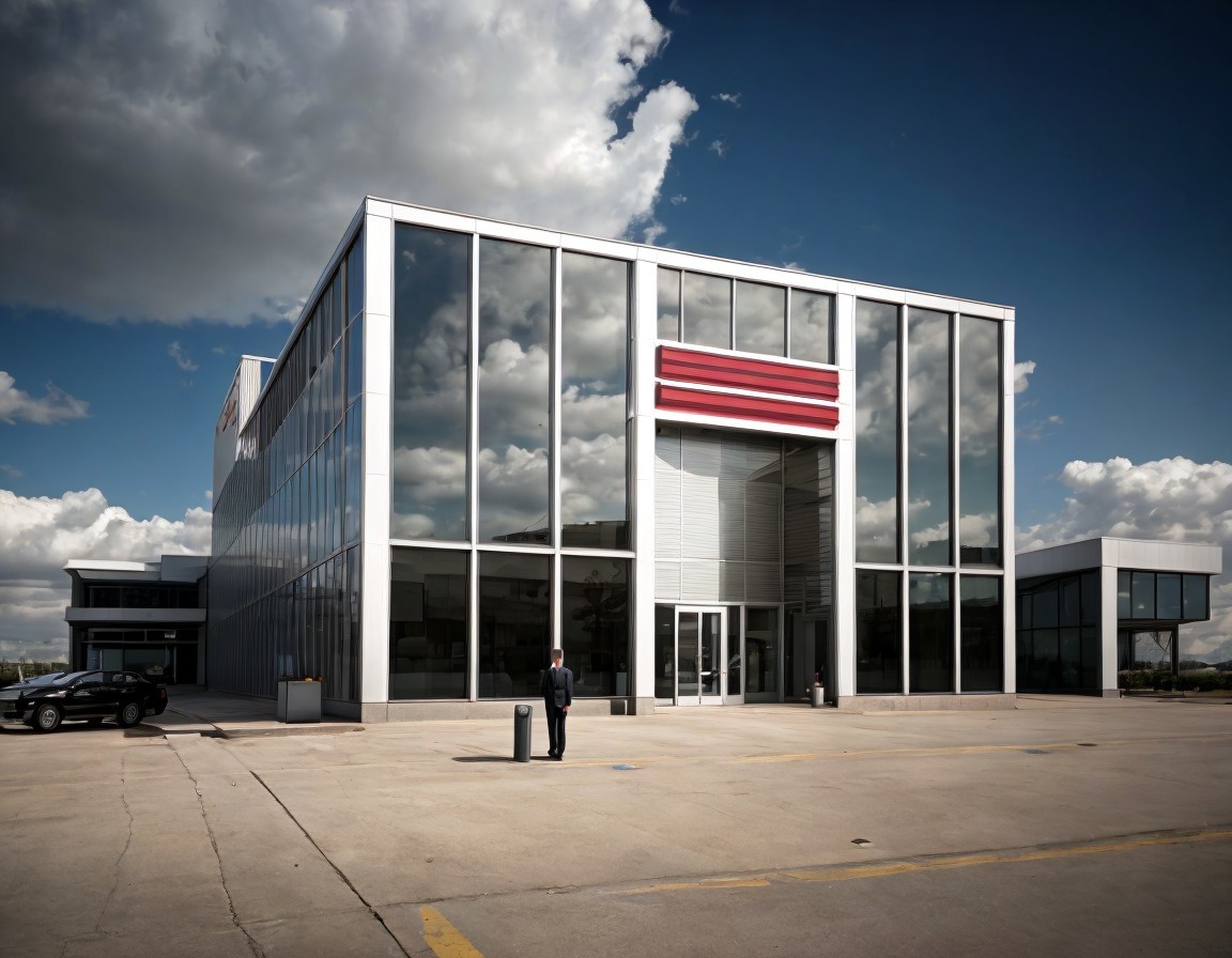 A confident man in a suit stands on a red carpet in the middle of an empty street, with modern skyscrapers under a blue sky in the background.