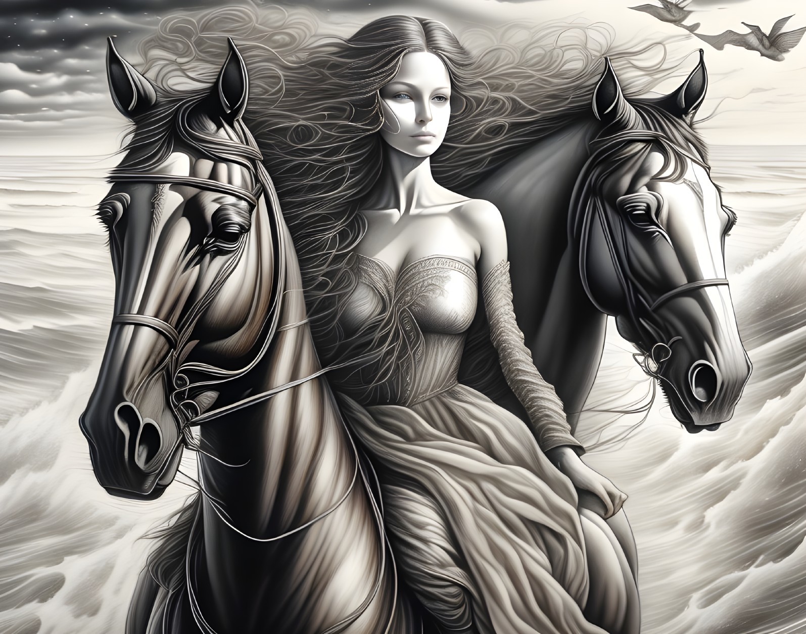 A monochrome illustration of a woman with flowing hair riding two horses, against a cloudy sky with a bird flying.