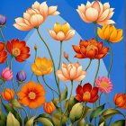 A woman with vibrant blue hair is adorned in a flowing turquoise gown, surrounded by colorful flowers under a bright sky filled with fluffy clouds, radiating a whimsical, enchanting vibe.