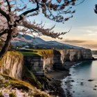 A stunning coastal scene features dramatic cliffs adorned with vibrant cherry blossoms. The sun sets over the calm ocean, casting a warm glow on the tranquil landscape and distant mountains.