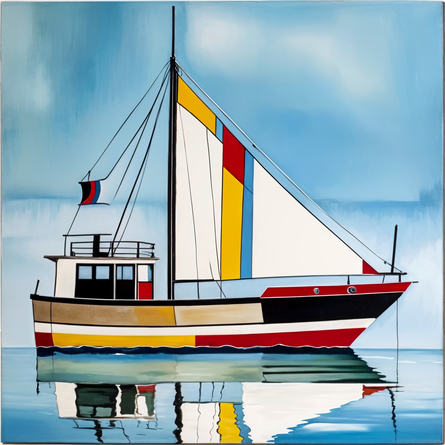 A colorful sailboat with vibrant red, yellow, and blue sails glides across a calm, reflective water surface, set against a backdrop of various blue shades, creating a serene maritime scene.