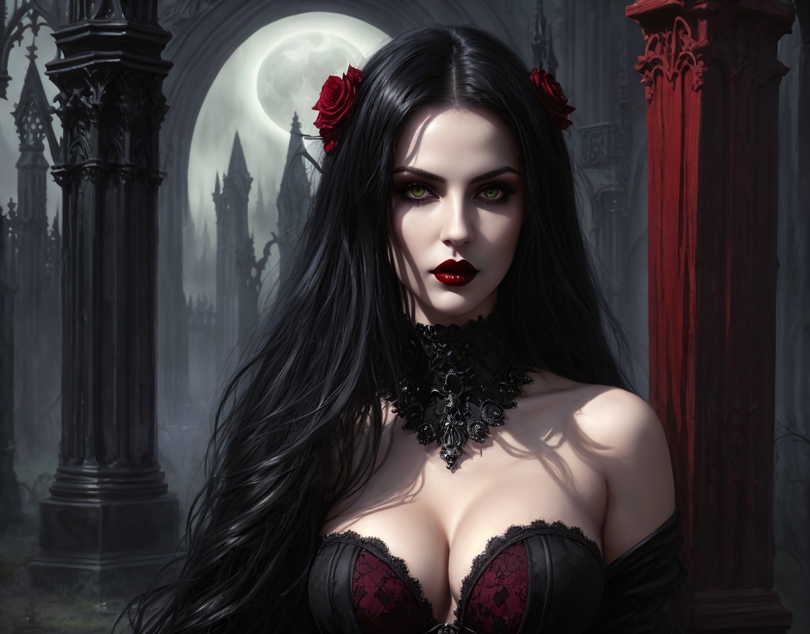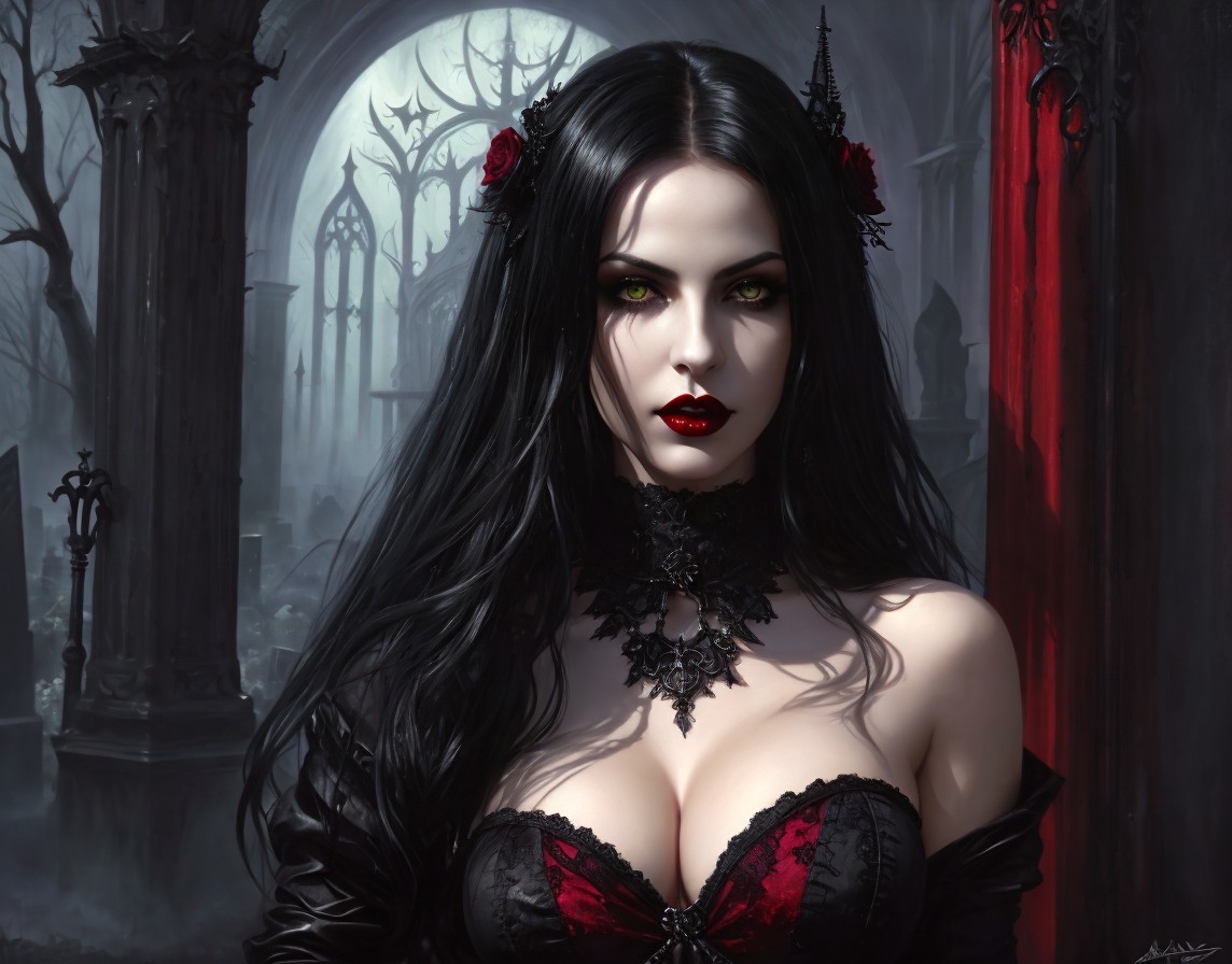 Prompt: "A sensuous vampire woman with dark clothing, A buxom female with long black hair, alluring, green eyes, full dark red lips, diamond shape face, pleasure, gothic, no, visible, realistic oil paintings, , dark gothic cemetery background, at night, Royo, Giger, gothic, mysterious"