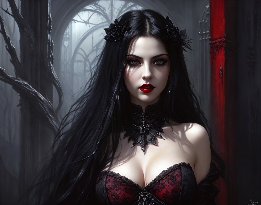 Prompt: ""A sensuous vampire woman with dark clothing, A buxom female with black hair, alluring, blue-grey eyes, big red lips, pleasure, gothic, no, visible, realistic oil paintings, , dark background, gothic bedroom, Royo, Giger, gothic, mysterious""