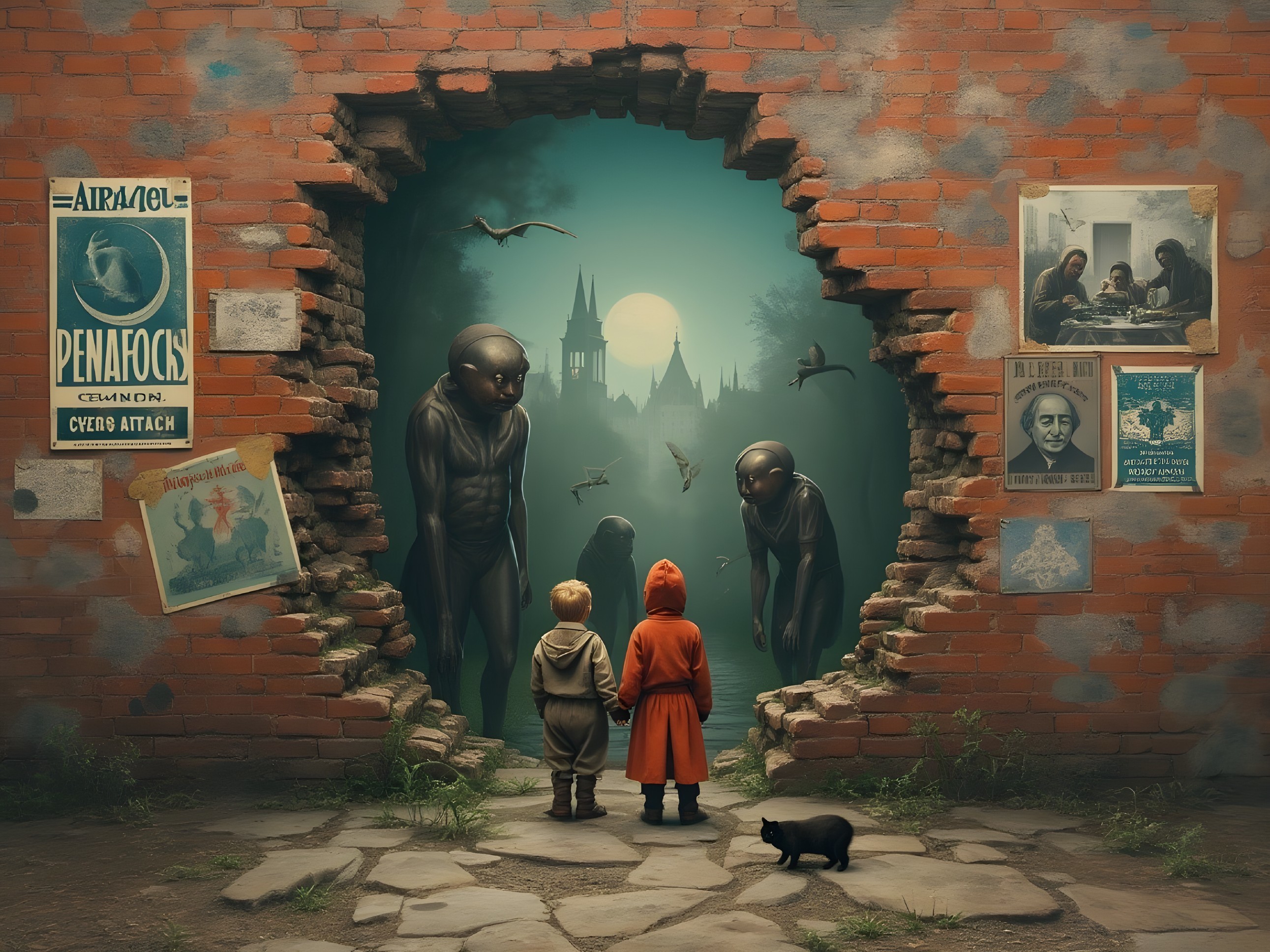 In the small, sleepy town, remembered only by the old, weathered industrial facilities on the outskirts, there was a wall that always fascinated the local children. The wall, a relic of times gone by, was littered with faded advertising posters that had once turned colorful promises into gray shadows. But the real secret of the wall was the large hole that had appeared in it one day, as if from nowhere. Siblings Lena and Milo, two curious souls who ran around in tattered clothes, had discovered this hole. Always by their side was their faithful cat Mowgli, whose keen eyes often showed paths that remained hidden to the children. One afternoon, when the sun was just right to shine through the hole, the children realized that it was more than just an opening - it was a window into another world. Through the hole, a surreal landscape was revealed, populated by strange, almost cultish creatures. These creatures had the shapes of common animals and people, but their colors and proportions were wildly distorted, as if a dream had abandoned the rules of nature. Meadows of shimmering grass stretched to the horizon, and the sky shimmered in an unusual spectrum of colors. Driven by a thirst for adventure and discovery, Lena and Milo decided to crawl through the hole, with Mowgli close on their heels. When they reached the other side, they were embraced by the surreal world. The creatures, which seemed threatening at first, turned out to be friendly and curious. They told the children about their world, where ideas sprout from the ground like seeds and thoughts can change the course of rivers. The children quickly learned that this world was fed by the imaginations and dreams of people from their own world. Their new friends explained that the hole represented a rare connection, a bridge between worlds that only became visible when the sun and moon were at a certain angle. As the day drew to a close, the children had one last conversation with a wise old creature that looked like a cross between an owl and a deer. It warned them that such holes are fleeting - and sure enough, as they looked back, the hole began to shrink. Lena, Milo and Mowgli returned through the hole just in time before it closed, leaving behind them a world as real as their dreams, yet hidden beyond reach behind an ancient wall. Back in their world, their clothes still covered in dust and their heads full of wonder, the children knew their lives would never be the same again. They had seen what was possible beyond the gray walls of their reality, and that knowledge made them dream bigger than ever before.