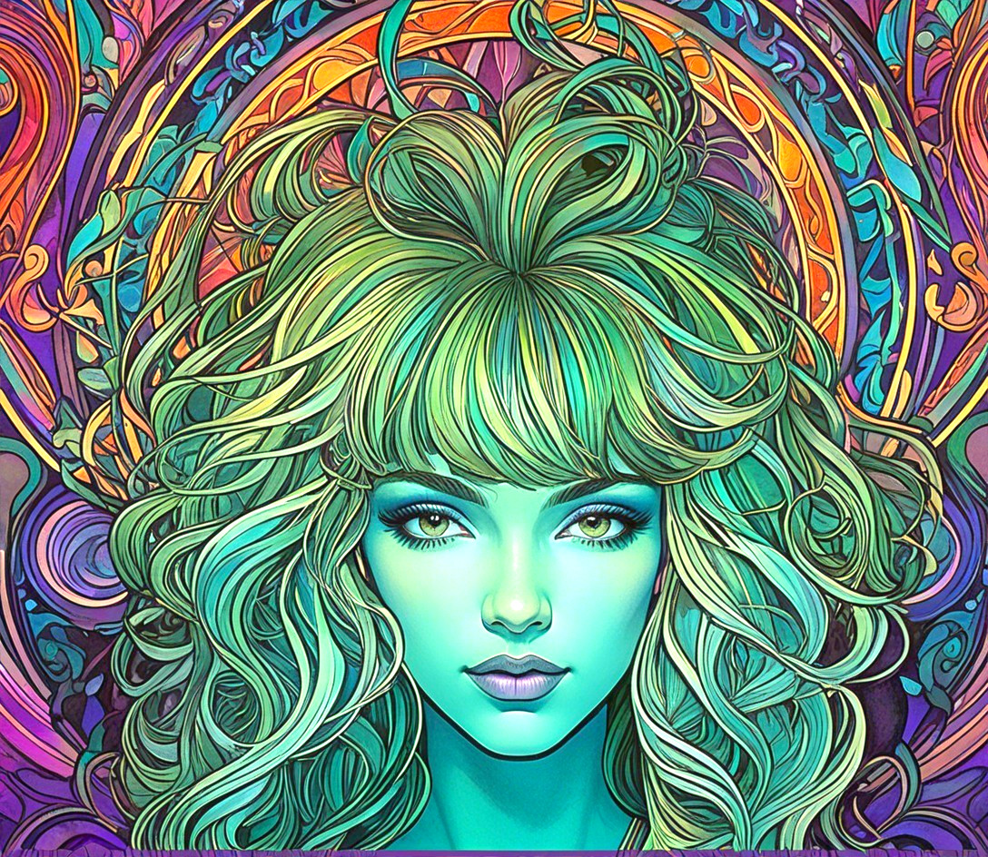 + Prompt:Stylized Portraiture, art nouveau, patterns in background, vibrant colors, line-art features, vivid illumination, abstract, stylization 1.3, enchantress with large hairbangs, squiggly lines, scratching, eroticism, hues, dyed, Watercolor details, cinematic wash, blurry edges effect, auracore, Byzantine face type, reminiscent of FrankMcCarthy and Overton Lloyd, infused, acetate, iceterine, hatching, ghostly, supernatural, cottagegore 1.7, close-up, octane render illustration 1.5, brightness 1.4, lighting by William Turner and Didier Lourenço, simplistic, high coloring 1.9, triadic color scheme beige green blue, juvenile, cel-shaded, somber, pastel colors of green and brown, vaporous illumination, raytraced shadows,