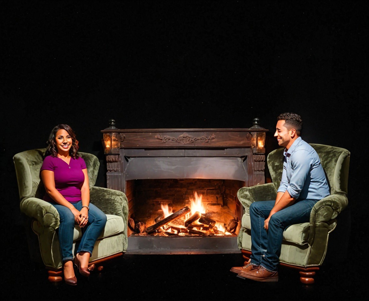 A cosy scene featuring two people sitting in green armchairs by a warm fireplace. The ambiance is intimate, with soft lighting enhancing the inviting atmosphere.