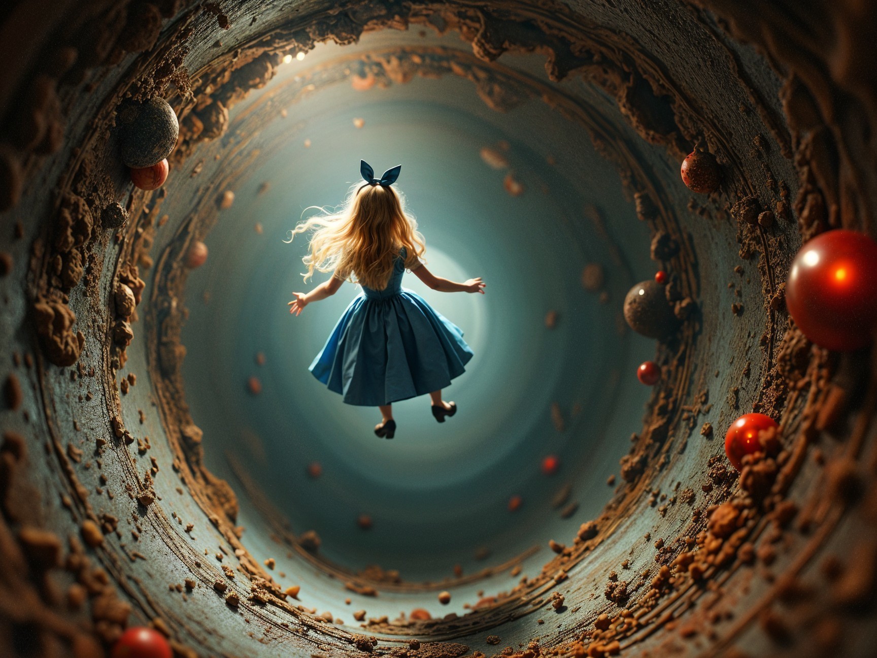 A girl in a blue and white dress descends a dark, spiraling tunnel, reminiscent of a fantasy world. Soft lights illuminate the walls, creating a mystical, dreamlike atmosphere.