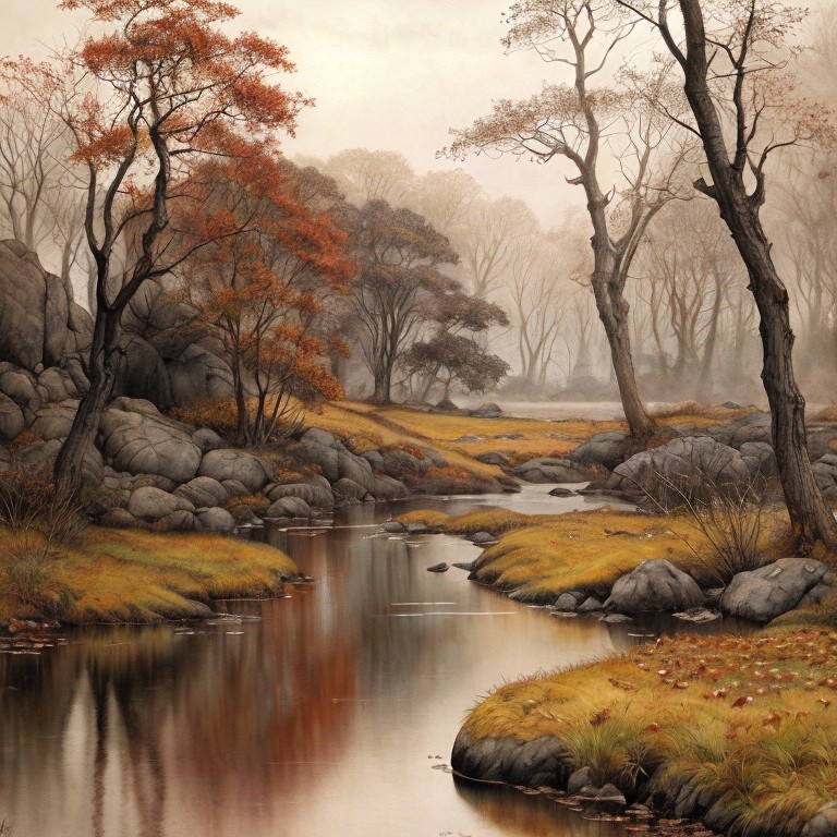 Vivid watercolor painting of a captivating wetland scene with boulders, autumn trees, and intricate details. The artwork features dramatic composition, muted tones, and a professional finish.