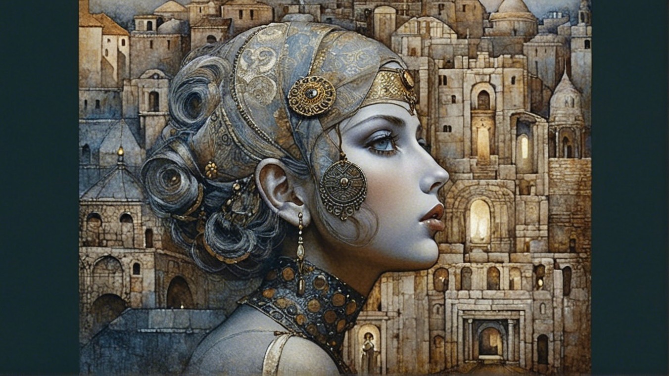 The image features a serene woman with intricate braided hair and elegant earrings, set against a backdrop of a mystical, illuminated city with domes and arches, evoking a dreamlike atmosphere.