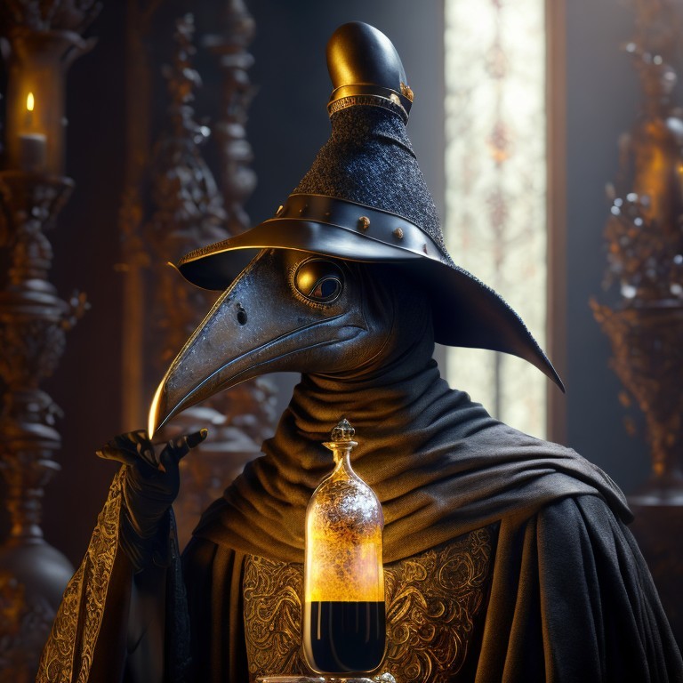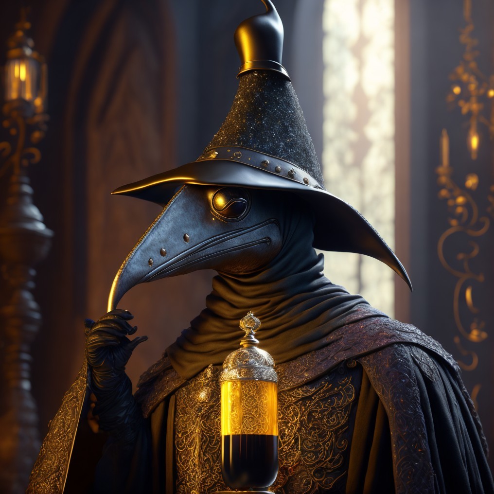 A person in a plague doctor costume with a beaked mask, holding a vial, stands in a dimly lit, ornate interior.