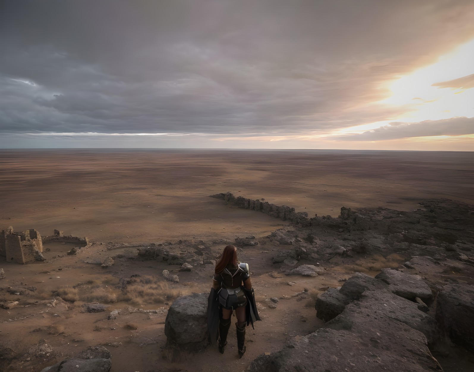 A female warrior overlooking a vast plain at sunset, with ruins and dramatic clouds in the sky.