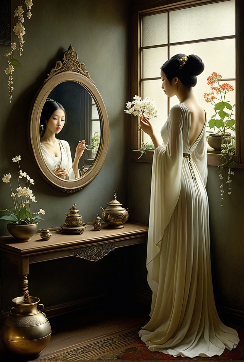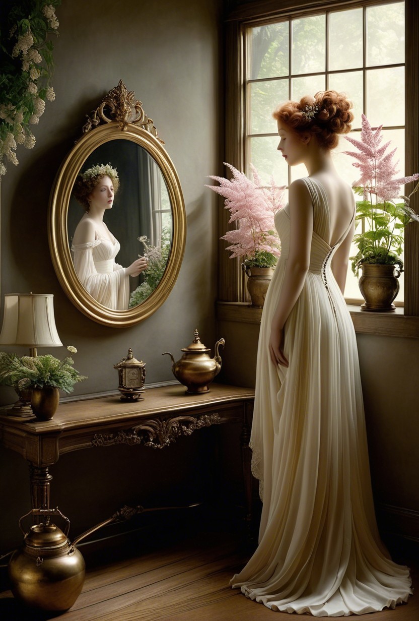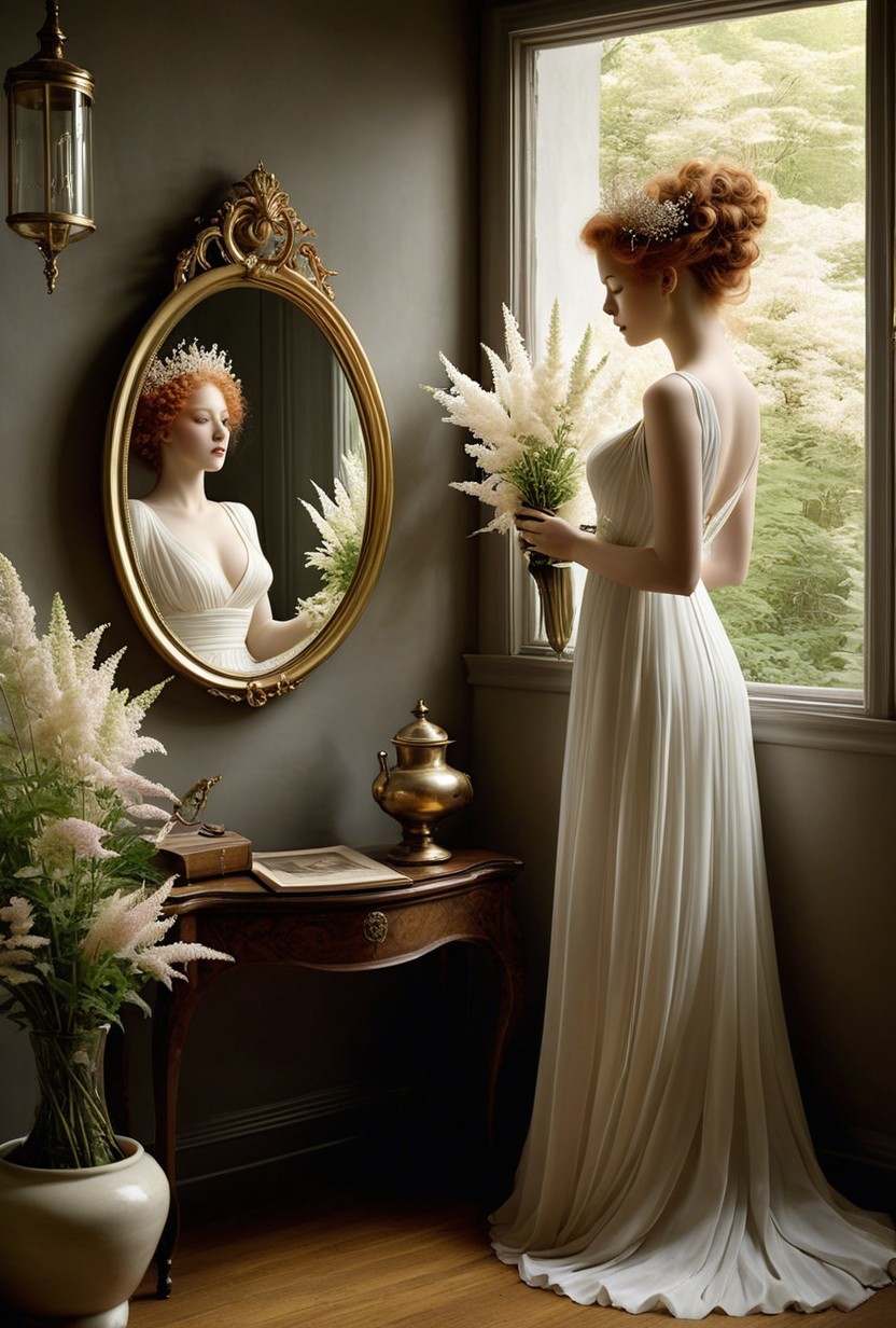 A graceful woman in a flowing, elegant gown stands by a stained-glass window, holding a delicate flower. Soft pastel colors and lush floral arrangements enhance the serene, vintage atmosphere.
