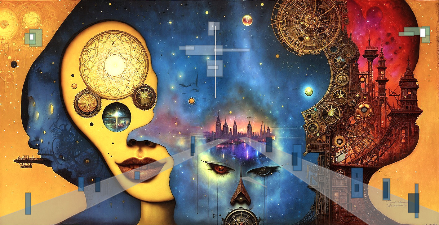 A surreal, cosmic landscape blends human faces with intricate clocks and dreamlike cityscapes, symbolizing time, consciousness, and the intersection of reality and imagination.