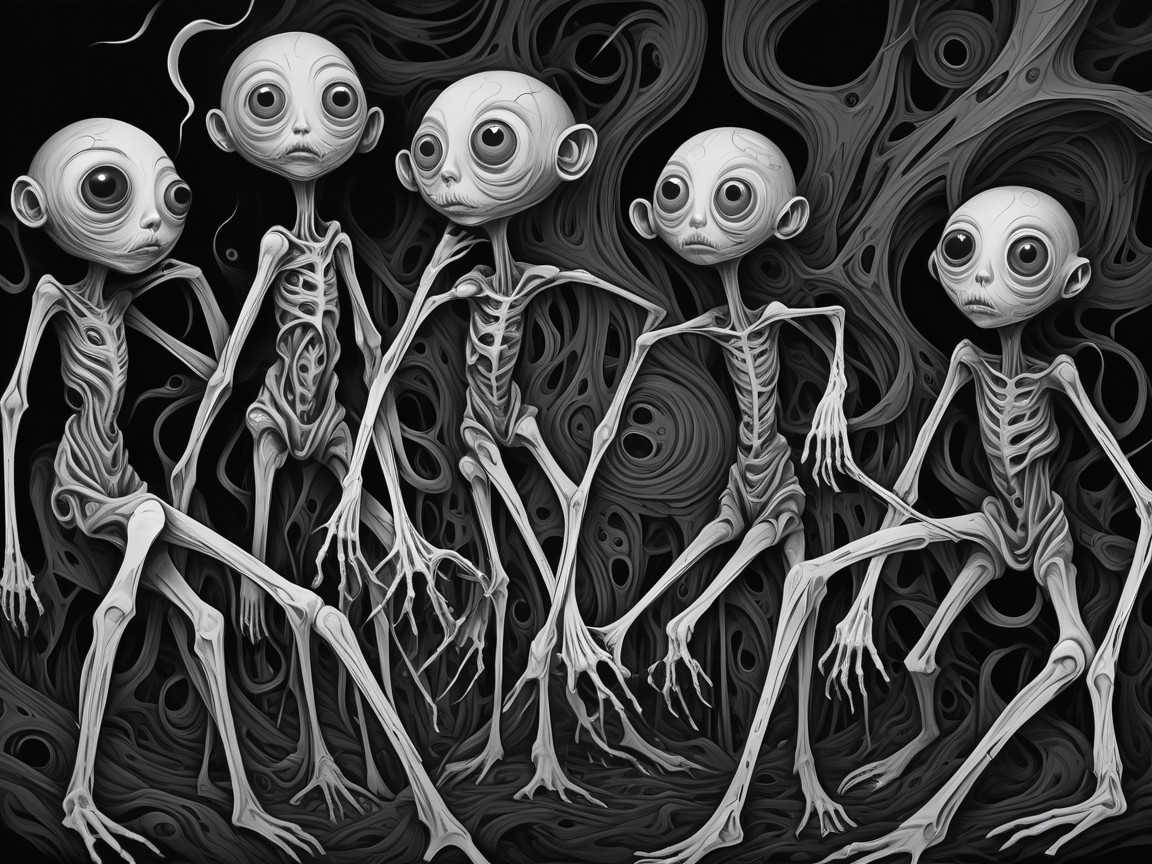 A surreal, black-and-white illustration of five slender, skeletal figures with oversized heads and wide eyes, set against a swirling, abstract background of dark, twisting shapes.