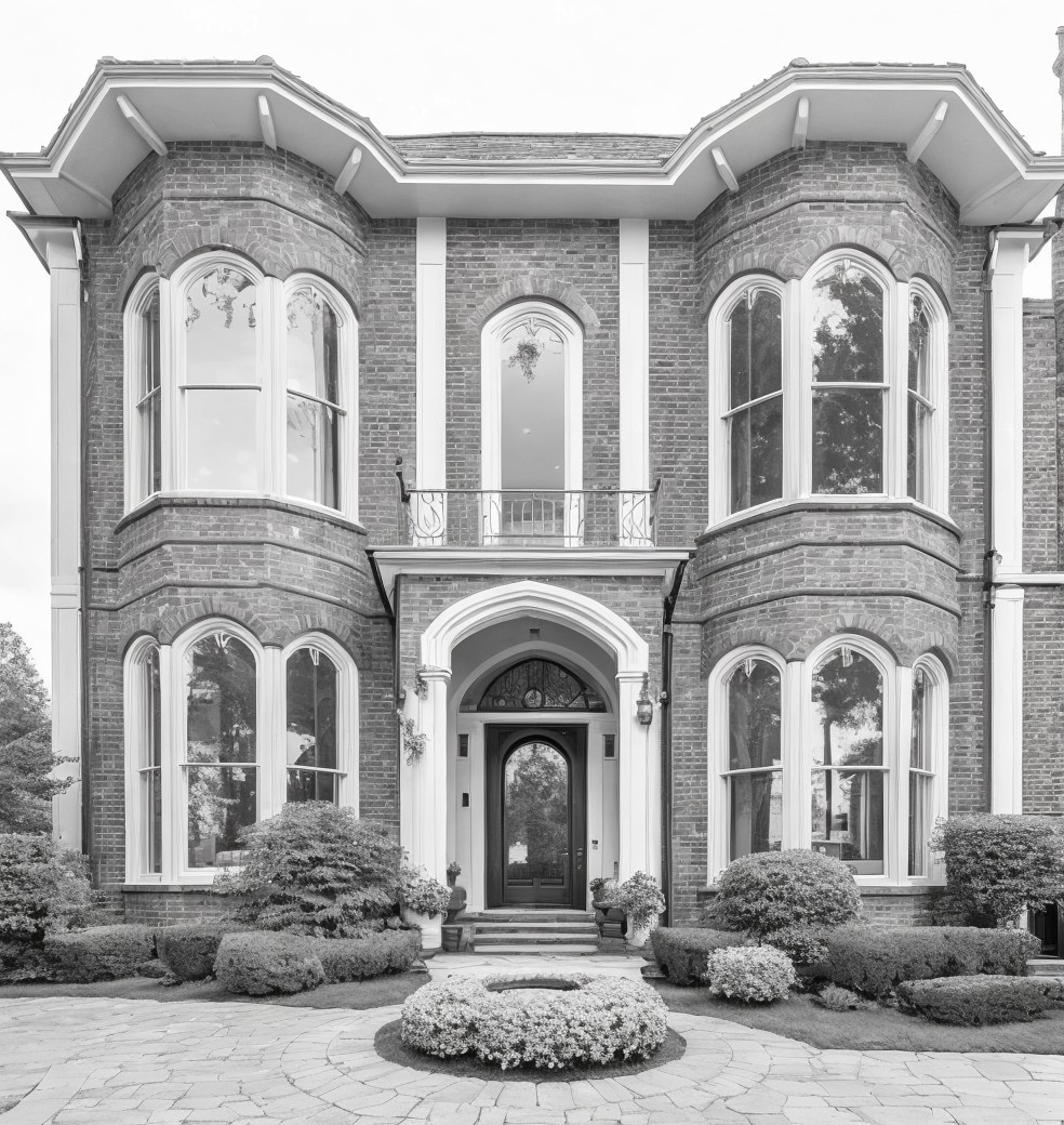 Symmetrical brick house with arched windows, a red door, and manicured garden.