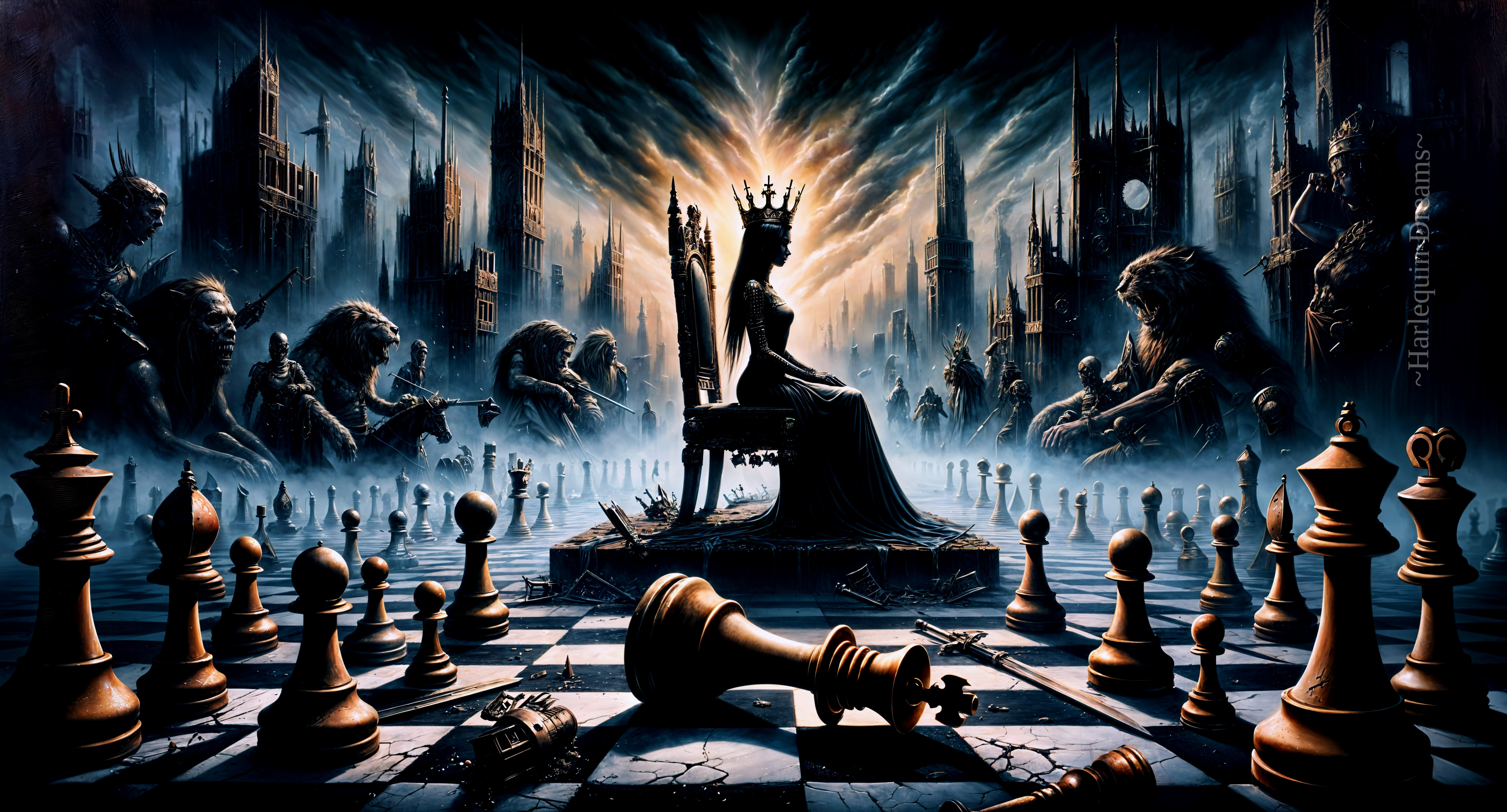 A dark, atmospheric scene with a queen seated on a throne in a desolate chessboard landscape. Surrounding her are ominous figures and towering ruins, evoking a sense of power and mystery.