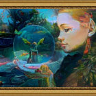 A serene young woman with flowing hair gazes lovingly at a white bird in her hand, surrounded by soft blue tones and gentle birds in flight, evoking a sense of peace and harmony with nature.