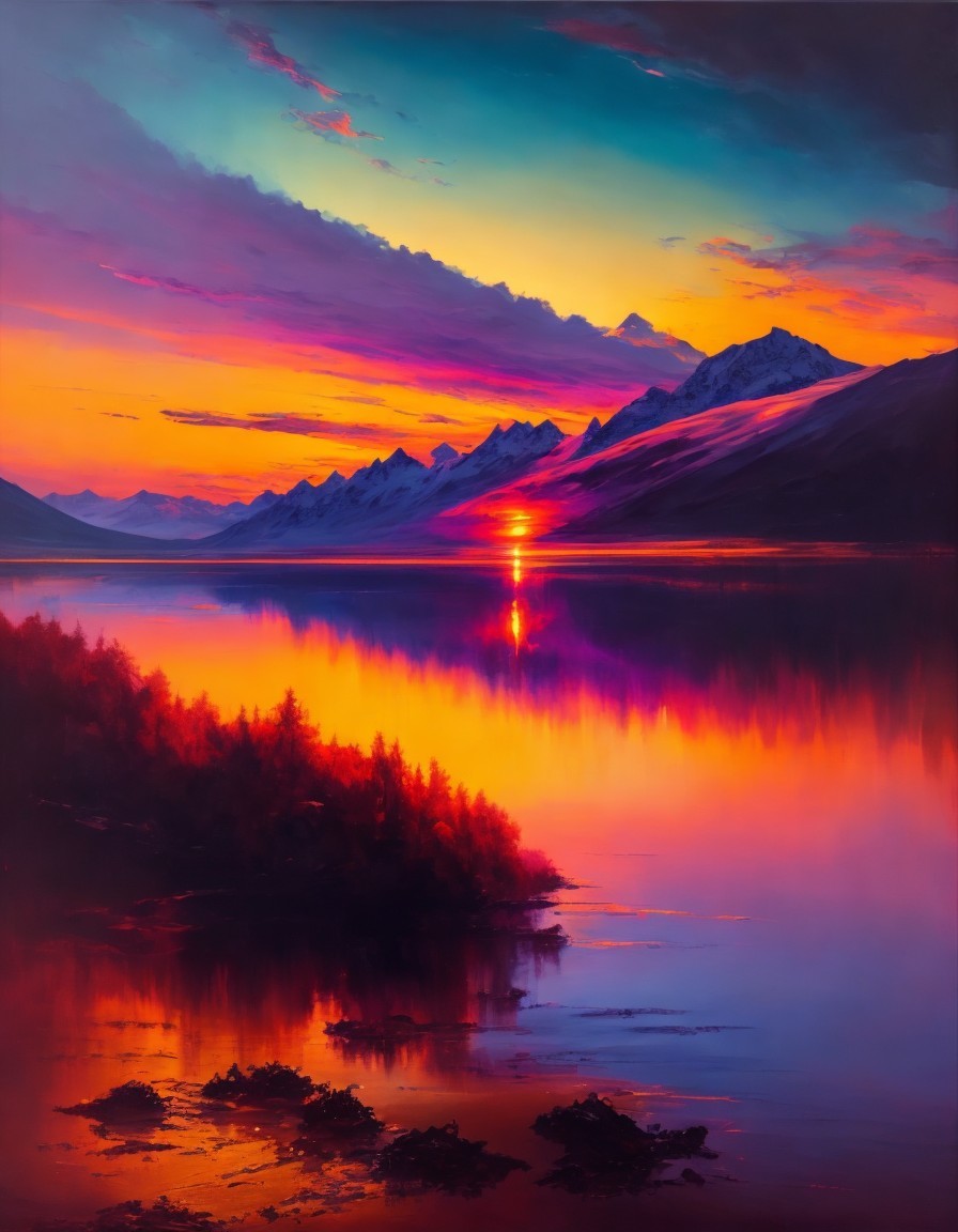 Prompt: "Oil on canvas, wide angle view, sunset landscape, glowing with vibrant hues, sky transitioning from warm orange to deep purple over a lake in swiss alps. Perfect composition. By William Turner."