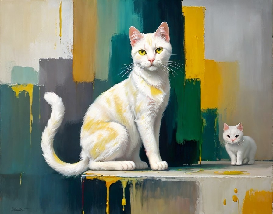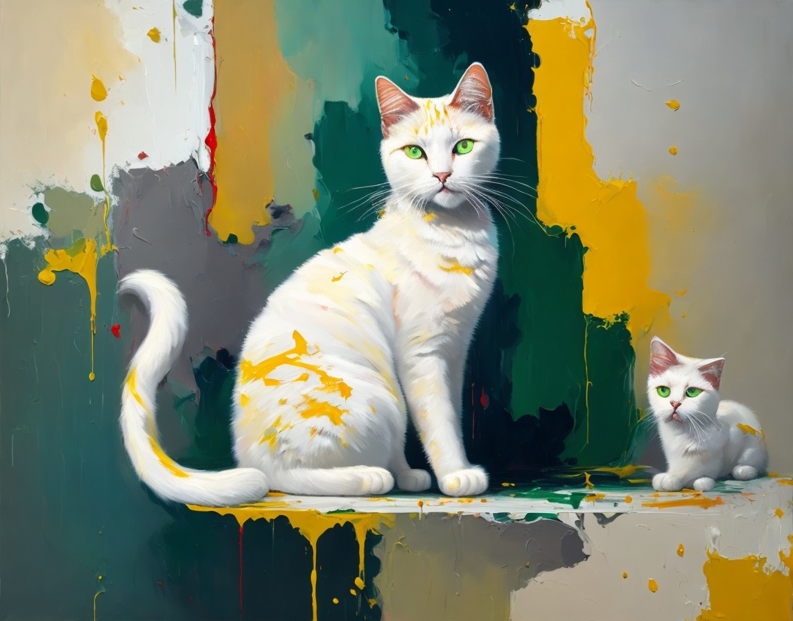 Two white cats with green eyes are posed against a backdrop with colorful paint drips, one significantly larger than the other.